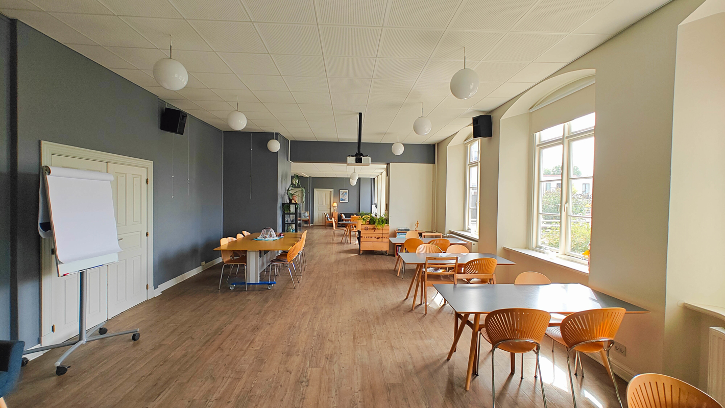 Skal du bruge stole og borde eller caféborde er de stablet i det tilstødende rum.