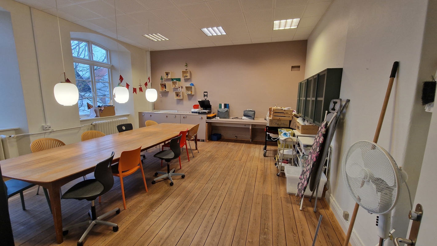 Design ligger i stueetagen og kan bookes til møder. Du skal dog være opmærksom på at lokalet også huser vores glasværksted, og Makerspaces tekstilværksted.