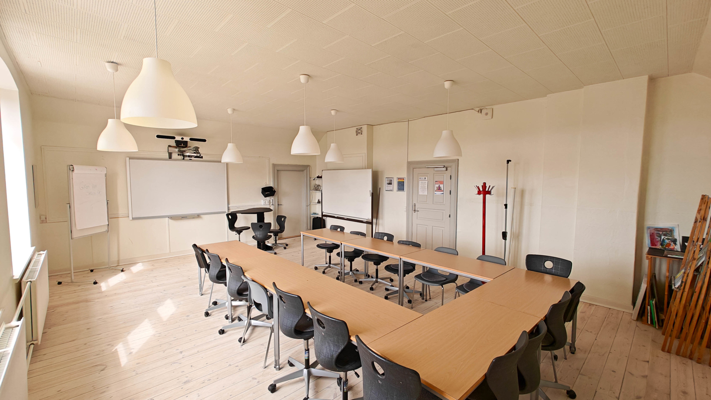 I lokalet er der smartboard og whiteboard.
