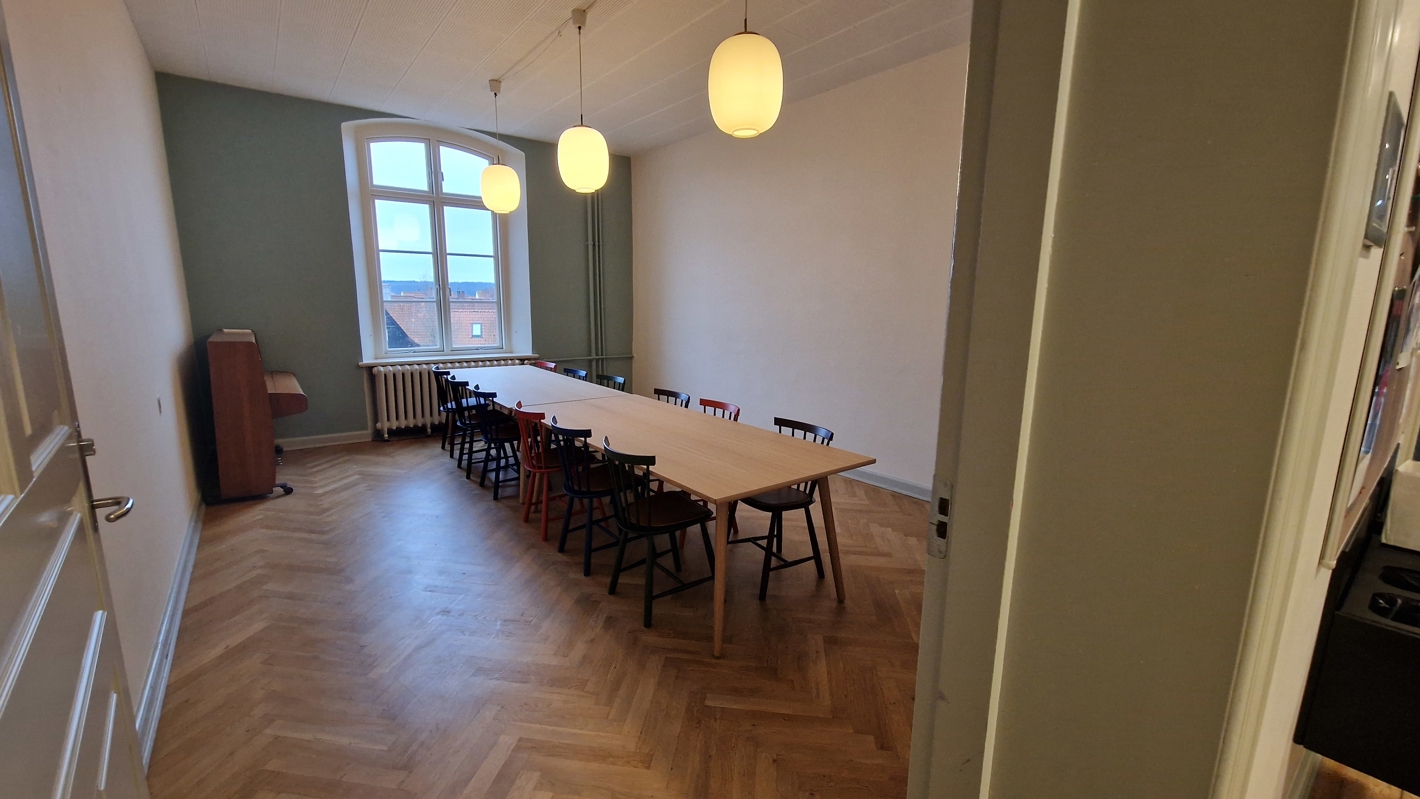 Der er mødebord med stole til 14 personer.